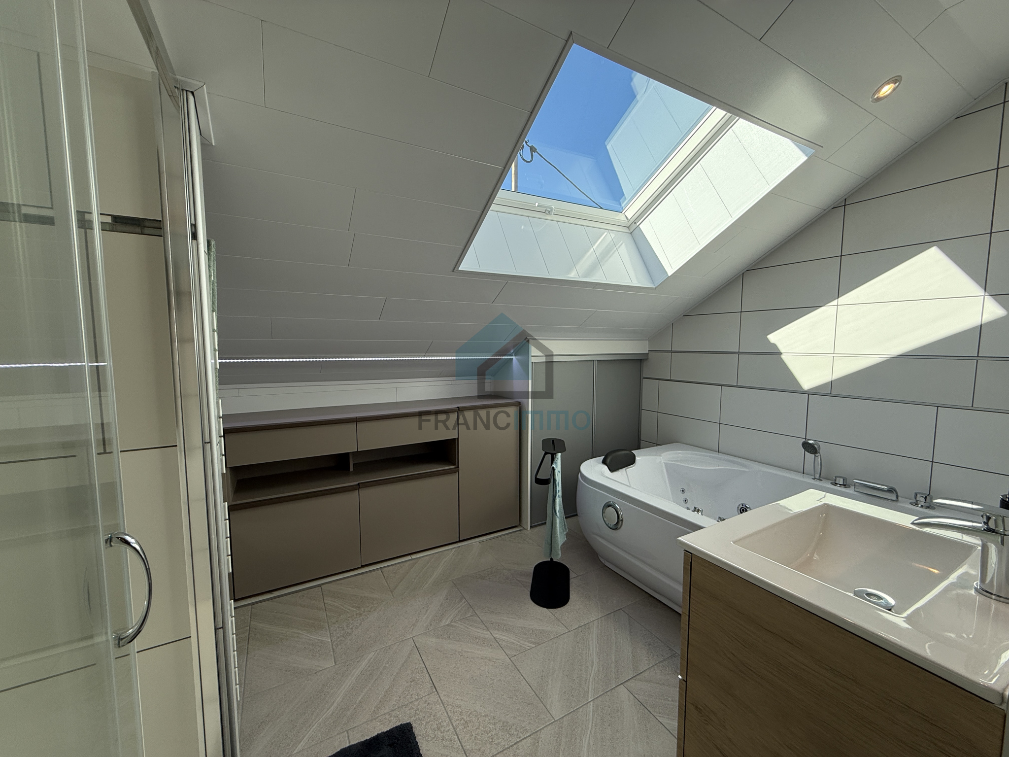 Baignoire balnéo, douche, 1 lavabo, 1 meuble